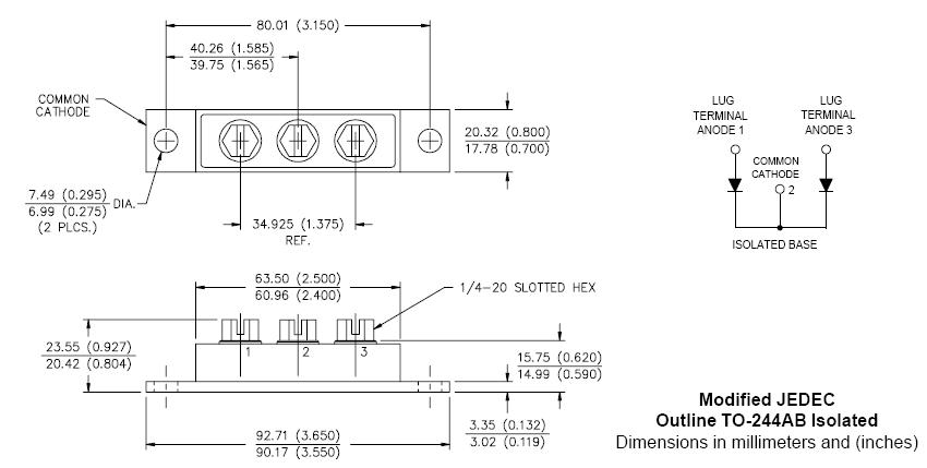 203CMQ080 features: (1)175℃ TJ operation; (2)Center tap module - Isolated Base; (3)High purity, high temperature epoxy encapsulation for enhanced mechanical strength and moisture resistance; (4)Low forward voltage drop; (5)High frequency operation; (6)Guard ring for enhanced ruggedness and long term reliability.