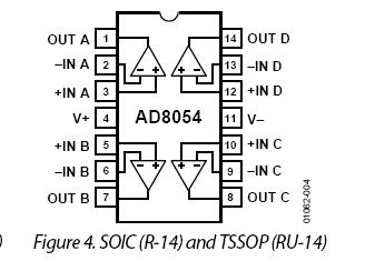 The AD8054AR is a quad low cost, high speed, voltage feedback amplifier. The AD8054AR operates on ±5 V supply at low supply current. It is true single-supply capability with an input voltage range extending 200mV below the negative rail and within 1V of the positive rail. The applications of the AD8054AR include Active filters, Analog-to-digital drivers, Clock buffer, Consumer video, Professional cameras, CCD imaging systems, CD/DVD ROMs.