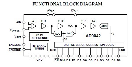 The AD9042AD is a high speed, high performance, low power, monolithic 12-bit analog-to-digital converter.