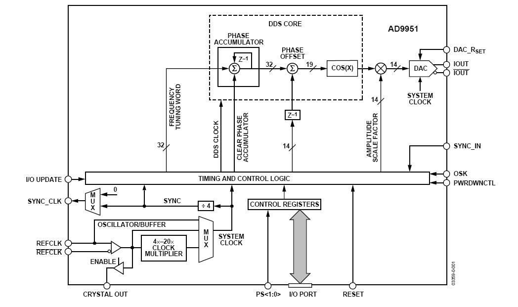 AD9955KS features: (1)400 MSPS internal clock speed; (2)Integrated 14-bit DAC; (3)32-bit tuning word; (4)Phase noise≤–120dBc/Hz @ 1 kHz offset (DAC output); (5)Excellent dynamic performance>80 dB SFDR @ 160 MHz (±100 kHz offset) AOUT; (6)Serial I/O control; (7)1.8 V power supply; (8) Software and hardware controlled power-down; (9)48-lead TQFP/EP package; (10) Support for 5 V input levels on most digital inputs; (11) PLL REFCLK multiplier (4× to 20×); (12) Internal oscillator, can be driven by a single crystal; (13) Phase modulation capability; (14) Multichip synchronization.
