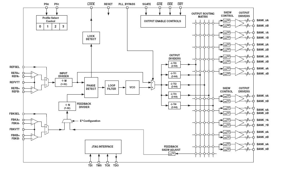 The CLK5620AV-01TN100I is an in-system-programmable high-fanout PLL-based clock driver. The CLK5620AV-01TN100I is designed for use in high performance communications and computing applications. The CLK5620AV-01TN100I provides up to 20 single-ended or 10 differential clock outputs. Each pair of outputs may be independently configured to support separate I/O standards (LVDS, LVPECL, LVTTL, LVCMOS, SSTL, HSTL) and output frequency. In addition, each output provides independent programmable control of termination, slew-rate, and timing skew. All configuration information is stored on-chip in nonvolatile E2CMOS memory.