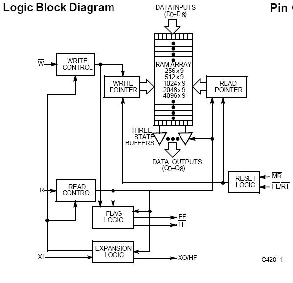 The CY7C425-10PC is a first-in first-out (FIFO) memory. The CY7C425-10PC is offered in 600-mil wide and 300-mil wide packages. They are, respectively, 256, 512, 1,024, 2,048, and 4,096 words by 9-bits wide. Each FIFO memory of the CY7C425-10PC is organized such that the data is read in the same sequential order that it was written. Full and Empty flags are provided to prevent overrun and under-run. Three additional pins are also provided to facilitate unlimited expansion in width, depth, or both. The depth expansion technique steers the control signals from one device to another in parallel, thus eliminating the serial addition of propagation delays, so that throughput is not reduced. Data is steered in a similar manner.