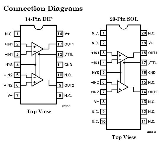 The EL2252CM is a dual comparator. It replaces the traditional input buffer a attenuator aECL comparator aECL to TTL translator circuit blocks used in digital equipment. The EL2252CM provides a quick 7 ns propagation delay while complying with g10V inputs. Input accuracy and propagation delay is maintained even with input signal Slew Rates as great as 4000 V/ms. The EL2252CM can run on supplies as low as b5.2V and a9V and comply with ECL and CMOS inputs, or use supplies as great as g18V for much greater input range. The applications of the EL2252CM include Pin receiver for automatic test equipment, Data communications line receiver, Frequency counter input, Pulse squarer.