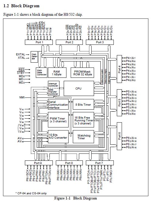 Features: (1)General-register machine: Eight 16-bit general registers, Five 8-bit and two 16-bit control registers; (2)High speed: Maximum clock rate: 10MHz (oscillator frequency: 20MHz) Expanded operating modes supporting external memory, Minimum mode: up to 64K-byte address space, Maximum mode: up to 1M-byte address space; (3)Highly orthogonal instruction set: Addressing modes and data size can be specified independently for each instruction; (4)1.5 Addressing modes: Register-register operations, Register-memory operations; (5)Instruction set optimized for C language: Special short formats for frequently-used instructions and addressing modes.