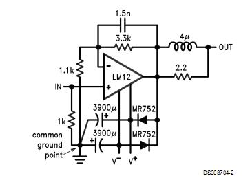The LM12CLK is a power op amp capable of driving ±25V at ±10A while operating from ±30V supplies. The LM12CLK can deliver 80W of sine wave power into a 4Ω load with 0.01% distortion. Power bandwidth is 60 kHz. Further, a peak dissipation capability of 800W allows it to handle reactive loads such as transducers, actuators or small motors without derating. The LM12CLK delivers ±10A output current at any output voltage yet is completely protected against overloads, including shorts to the supplies.