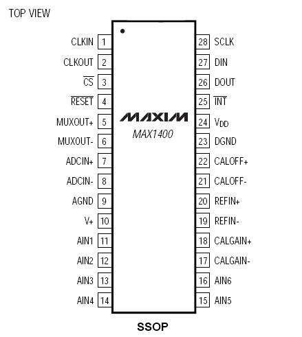 MAX1400EAI features: (1)18-Bit Resolution, Sigma-Delta ADC; (2)16-Bit Performance with No Missing Codes to 480sps; (3)Low Quiescent Current 250μA (operating mode), 2μA (power-down mode); (4)3 Fully Differential or 5 Pseudo-Differential Signal Input Channels; (5)2 Additional Fully Differential Calibration Channels/Auxiliary Input Channels; (6)Access to the Mux Output/ADC Input; (7)Programmable Gain and Offset; (8)Fully Differential Reference Inputs; (9)Converts Continuously or On Command; (10)Automatic Channel Scanning and Continuous Data Output Mode; (11)Operates with +5V Analog Supply and +3V or +5V Digital Supply; (12)SPI/QSPI Compatible 3-Wire Serial Interface; (13)28-Pin SSOP Package.