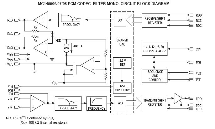 The MC145506P is a PCM Codec-Filter Mono-circuit. The MC145506P performs the voice digitization and reconstruction, as well as the band limiting and smoothing required for PCM systems. It has HCMOS compatible digital outputs and otherwise supplement. The MC145506P is functionally similar to the MC145502, MC145503, and MC145505, respectively. It is designed to operate in both synchronous and asynchronous applications and contain an on–chip precision reference voltage. The MC145506P is offered in a 22–pin package and has the capability of selecting from three peak overload voltages (2.5 V, 3.15 V, and 3.78 V).