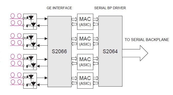 S2064A features: (1)Broad operating rate range (0.7 - 1.3 GHz), 1062 MHz (Fibre Channel); 1250 MHz (Gigabit Ethernet) line rates; 1/2 Rate Operation; (2)Quad Transmitter with phase-locked loop (PLL) clock synthesis from low speed reference; (3)Quad Receiver PLL provides clock and data recovery; (4)Internally series terminated TTL outputs; (5)On-chip 8B/10B line encoding and decoding for four separate parallel 8-bit channels; (6)32-bit parallel TTL interface; (7)Low-jitter serial PECL interface; (8)Local Loopback; (9)Interfaces with coax, twinax, or fiber optics; (10)Single +3.3V supply, 2.3 W power dissipation; (11)Compact 23mm x 23mm 208 TBGA package.