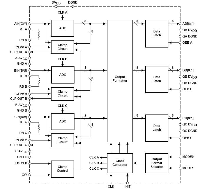 ![]() Video A/D Converter ICs 8B 30MSPS ADC Triple Ch Digital Clamp |